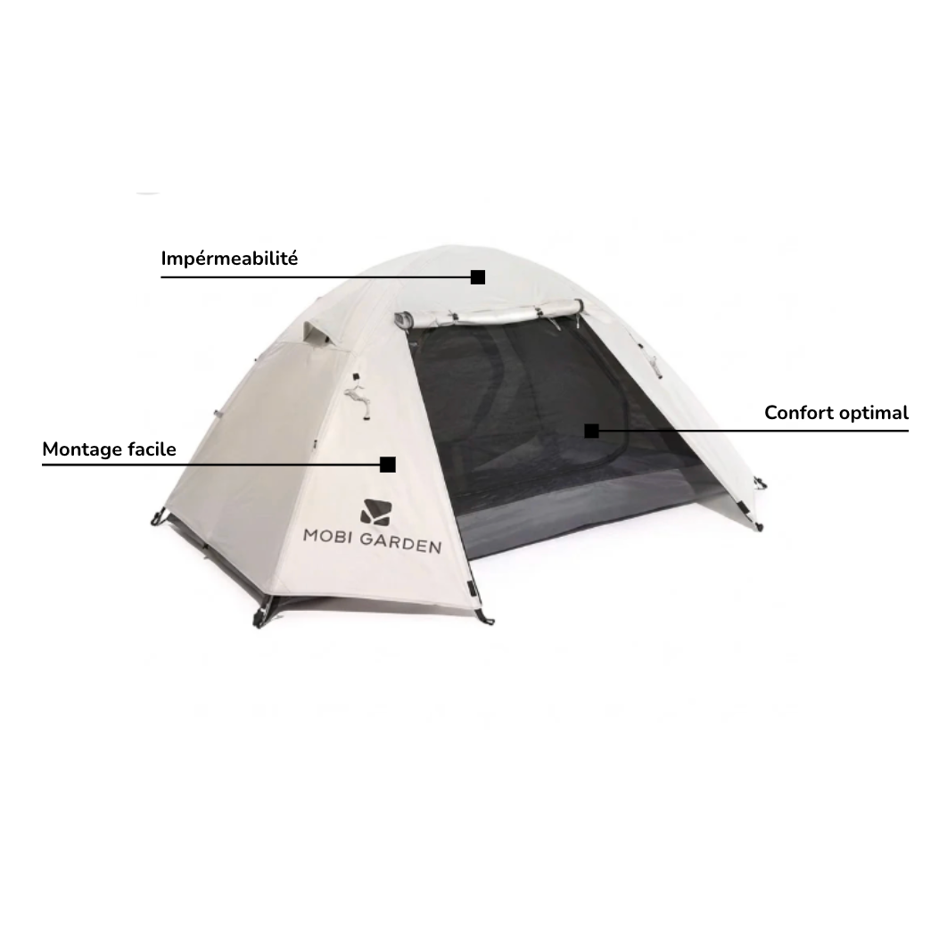 Rempart contre la pluie : Avec un indice d'étanchéité de 3000 mm au sol comme au toit, dormez au sec. La conception double toit + tissu polyester 201T est votre alliée contre les intempéries.